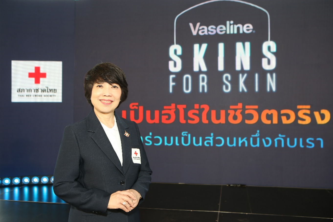 นางจันทร์ประภา วิชิตชลชัย รองผู้อำนวยการสำนักงานจัดหารายได้ สภากาชาดไทย กล่าวว่า “สภากาชาดไทยมีภารกิจในการให้บริการรักษาพยาบาล ฟื้นฟูสภาพ สร้างเสริมสุขภาพและป้องกันโรคให้แก่ประชาชน โดยได้จัดตั้งธนาคารผิวหนัง (Skin bank) ขึ้นครั้งแรกในประเทศไทยเมื่อปี พ.ศ. 2558 เพื่อจัดเก็บผิวหนังจากผู้บริจาคอวัยวะและเนื้อเยื่อที่เสียชีวิตสำหรับให้บริการแก่โรงพยาบาลต่างๆ ทั่วประเทศ ที่ต้องการนำไปใช้รักษาแผลผู้ป่วยไฟไหม้ น้ำร้อนลวก หรือประสบอุบัติเหตุขั้นรุนแรง เพื่อช่วยบรรเทาความเจ็บปวดและลดโอกาสพิการหรือเสียชีวิต พร้อมทั้งเพิ่มโอกาสกลับไปใช้ชีวิตได้ตามปกติให้แก่ผู้ป่วย แต่ผิวหนังสำรองในธนาคารผิวหนังของสภากาชาดไทยกำลังตกอยู่ในสภาวะขาดแคลนจนไม่สามารถส่งมอบให้กับโรงพยาบาลต่างๆ นำไปใช้รักษาผู้ป่วยได้ในทันที การสร้างการรับรู้เกี่ยวกับการบริจาคผิวหนังจึงเป็นวาระสำคัญเร่งด่วนที่ต้องได้รับการส่งเสริมจากทุกภาคส่วนให้เกิดขึ้นอย่างเป็นรูปธรรม ในโอกาสนี้ สภากาชาดไทยขอขอบคุณวาสลีนที่ได้ริเริ่มโครงการสกินส์ ฟอร์ สกิน และขอบคุณเซเว่น อีเลฟเว่น ที่อำนวยความสะดวกเป็นช่องทางจัดจำหน่ายผลิตภัณฑ์ ‘วาสลีน ปิโตรเลียม เจลลี่ ลิมิเต็ด อิดิชัน’ เพื่อระดมเงินทุนสนับสนุนการดำเนินงานของศูนย์รับบริจาคอวัยวะ สภากาชาดไทย ร่วมถ่ายทอดภารกิจของสภากาชาดไทยผ่านโครงการ “สกินส์ ฟอร์ สกิน” ที่เป็นจุดเริ่มต้นในการดูแลผิวเพื่อสร้างความสำคัญและเกิดคุณค่าเมื่อได้ร่วมบริจาคผิวหนังเพื่อผู้ป่วยที่ได้รับผลกระทบจากเหตุการณ์ต่างๆ เพื่อให้พวกเขาได้มีโอกาสใช้ชีวิตได้อย่างมีความสุขต่อไป”